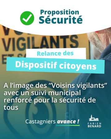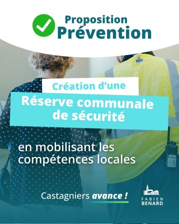 Nos propositions pour faire avancer Castagniers ! La sécurité est une priorité pour les castagnérenques. Nous améliorerons les infrastructures existantes et mettrons en place de nouvelles solutions pour favoriser un environnement de vie serein pour tous ! Nous relancerons les dispositifs “Voisins vigilants” dans les quartiers, qui ont été laissés de côté durant les derniers mandats. Une réserve communale de sécurité sera lancée, aux côtés de nos pompiers et professionnels de sécurité, pour mobiliser les compétences des habitants pour la sécurité de tous. La prévention des risques est un sujet d’extrême importance pour notre commune. Nous organiserons des campagnes d’information et de consultation des habitants à la hauteur des enjeux de sécurité, notamment face au risque de chute de rocher.